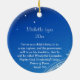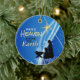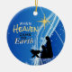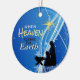 Um Enfeites de natal personalizado inspiracional retrata uma bela cena da natividade Silhouette sob uma estrela ouro e um fundo em tons de azul e branco com céus estelares preenchidos e glória descendo. Ele apresenta a saudação, 'Quando o céu chegou à Terra.' Personalizada a parte traseira com um nome e uma data.O Verso da Bíblia traseira pode ser modificado. Fundo azul de inverno com flocos de neve, CC BY 3.0 US no Flower Vetor.*