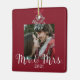 O ornamento de recém-casados é vermelho. Foto em dupla face com tipografia "Sr. & Sra." com um belo erro branco. Personalize seu casamento e sua foto personalizados. Um presente de casamento memorável.