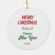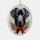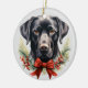 Na frente deste ornamento de Feriado está uma imagem de um lindo cachorro preto Labrador Retriever olhando por cima de uma morango vermelha e agulha de pinheiro metade da coroa. A coroa está decorada com um arco vermelho brilhante na parte inferior. O verso do ornamento tem o seu texto personalizado em vermelho, ouro e verde. Faça-o dizer o que quiser!