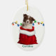 Na frente deste ornamento de Feriado está uma imagem de um adorável cachorrinho vermelho e branco da Border Collie em uma bolsa de presente de Natal. Atrás do cachorro há uma série de luzes coloridas de Feriado. O texto no final diz "Feliz Natal". A parte traseira do ornamento tem a mesma imagem com um campo de nome personalizado.