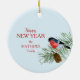 Aqui está uma maneira séria de cumprimentar a família e os amigos na temporada de Férias. Este ornamento bonito apresenta uma poinsettia e um buquê verde com um cardeal vermelho perverso. À direita está o texto vermelho que diz "Feliz Natal". A parte de trás do ornamento tem um toque colorido em uma tosse de pinheiro, e o texto "Feliz ano novo" com campos de texto adicionais para você personalizar. Tudo é colocado sobre um fundo azul claro do céu.