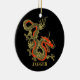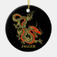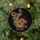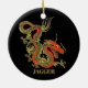 Um dragão chinês preto feroz esboçado em ouro decora este Enfeites de natal. Acentos vermelhos destacam a mandíbula, a cabeça e a coluna do dragão. Seu nome está escrito em negrito ouro abaixo.