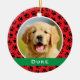 Este ornamento festivo e personalizado pode ser personalizado com uma fotografia fofa do seu cão (ou gato) de estimação e do seu primeiro nome. Inclui uma cor vermelha de fundo com uma faixa verde monograma e um padrão de impressão de pata preta. Faz um presente de Natal único para amantes de cães ou para celebrar o primeiro Natal do filhote!