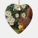 Red squirrel eating a mushroom against a backdrop of daisies on heart ornament.