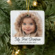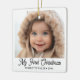 Ornamento De Cerâmica Retro Script Baby's First Christmas Photo