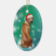 Na frente deste ornamento de Feriado está uma imagem de um cão Ridgeback rodesiano vestindo um chapéu de Papai Noel vermelho e branco. A imagem destaca-se em relação a um fundo verde gradiente e a um fundo azul. O verso do ornamento tem o mesmo fundo com texto branco personalizado que diz atualmente "Feliz Feliz ano novo de Natal" e a data.