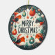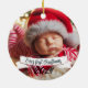 Uma ilustração festiva e lúdica de Natal, com quatro robins alegres, cada um vestindo um chapéu de Papai Noel ou um gorro de inverno. Ao redor dos pássaros estão decorações de férias como ornamentos, holly, estrelas e flocos de neve, todas organizadas em composição circular. No centro, as palavras "Feliz Natal" são apresentadas em caracteres negros e caprichosos. O design usa uma paleta de cores vibrante de cor laranja, verde, vermelha e branca, colocada sobre um fundo escuro, evocando um espírito de feriado alegre. Mude a foto e o nome para o seu querido bebê e tenha um presente de ornamento de árvore da família festiva!