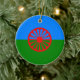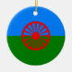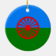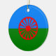 Esta design apresenta a bandeira romani, que é a bandeira internacional das pessoas romanichéis. A bandeira é constituída por um fundo azul e verde, representando os céus e a terra, respectivamente; contém também uma chacra vermelha de 16 raios, ou uma cartela, no centro, que representa a tradição itinerante das pessoas romanichéis e é também uma homenagem à bandeira da Índia. A bandeira foi aprovada pelos representantes de várias comunidades romanichéis no primeiro Congresso Mundial Romani (WRC), realizado em Orpington em 1971.