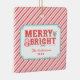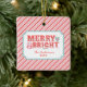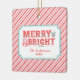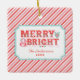 Este Enfeites de natal apresenta uma design alegre com texto que diz "Feliz e Brilho." Você pode personalizar com seu nome e ano na base. No verso há outro padrão de stripe diagonal vermelho e rosa.