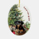 Na frente deste ornamento de Férias está a imagem de um adorável filhote Rottweiler deitado na sua cama de vime em frente a uma árvore de Natal decorada. O texto vermelho curvo no lado diz "NATAL". No verso, o texto vermelho e verde diz MERRY CHRISTMAS", e há campos de texto adicionais para você personalizar o que quiser.