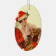Uma mulher de vintage com um traje de Papai noel está tricotando um estoque para os feriados.