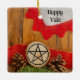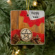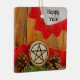 Mande seus desejos de férias para este solstício de inverno com o encantador Ornamento de Férias Rustic Pine Cones Happy Yule. Este pagão personalizado ou wiccan Yuletide sabbat decorado apresenta uma fotografia típica de dois cones de pinheiro castanho, galhos de pinheiro verde e fatia natural de madeira com pentáculo e um lace vermelho vintage aparado de grão branco com um fundo de madeira castanho.