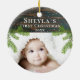 Rústica Wood Pine Baby's First Christmas Photo Ornament com ramos de árvores de Natal. O fundo é madeira rústica escura com flocos de neve e galhos de pinheiros. O texto está na moda tipografia branca. Personalize o ornamento com a foto, o nome e o ano de nascimento do seu bebê - insira sua foto favorita. Um excelente de férias para você ou um presente para sua família e amigos.