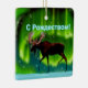 Uma imagem de um alce silenciada contra as luzes do Norte, um pouco estilizada. O texto cirílico que lê "S Rozhdestvom" (С Р ж д е т с в о мо - Uma saudação de Natal russa) aparece em azul e branco brilhantes.