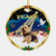 Um Nordesejo Terrier assiste três sábios a caminharem em direção a Belém como uma pomba da paz pairando à luz das estrelas.