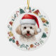 Aqui está um adorável ornamento personalizado para qualquer um que ama um pequeno Cachorro Bichon Frise. A frente tem um Bichon branco de aquarela vestindo um chapéu de Papai Noel vermelho e branco. A imagem é enquadrada dentro de uma coroa circular colorida composta por várias imagens de Férias, incluindo um boneco de neve, sinos, cana doce, estocagem, Holly e muito mais! A parte de trás do ornamento tem a mesma imagem de coroa com seu texto personalizado em verde e vermelho.