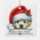 On this cute Holiday ornament, an adorable little Golden Retriever puppy peers out from a red and white Santa Claus hat that is decorated with a holly and berry sprig. The text at the bottom front says "Merry Christmas". The same image is on the back, but the text that says "Happy New Year" is a custom text field that you may easily change to a name or a signature, if you'd like.