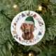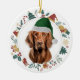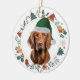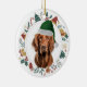Aqui está um lindo ornamento personalizado para qualquer um que ama um cachorro do Irish Setter. A frente tem um lindo Setter Irlandês vestindo um chapéu de Papai Noel verde e branco. A imagem é enquadrada dentro de uma coroa circular colorida composta por várias imagens de Férias, incluindo um boneco de neve, sinos, cana doce, estocagem, Holly e muito mais! A parte de trás do ornamento tem a mesma imagem de coroa com seu texto personalizado em verde e vermelho.