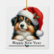 On this cute Holiday ornament, an adorable little Shetland Sheepdog puppy peers out from a red and white Santa Claus hat that is decorated with a holly and berry sprig. The text at the bottom front says "Merry Christmas". The same image is on the back, but the text that says "Happy New Year" is a custom text field that you may easily change to a name or a signature, if you'd like.