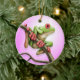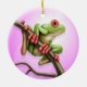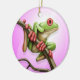 Um sapo de árvore verde é empoleirado em um ramo na frente de uma luz - fundo cor-de-rosa. O sapo está olhando fora à direita com um dele é olhos vermelhos brilhantes visíveis. As mãos vermelhas e os pés da cara pequena são envolvidos em torno de um ramo marrom magro que comece na parte inferior do design e mova e para a esquerda. Este design brilhante e colorido faz um ornamento bonito e brincalhão.