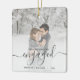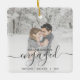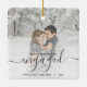 Comemore o seu noivado com este belo ornamento moderno do keepsasaame. O texto da cinza lê "Nosso primeiro Natal engajado", com a palavra "engajado" em uma escrita elegante com florescimento antes e depois. Substitua a imagem de exemplo por sua foto favorita e adicione seus nomes e o ano. Um filtro de gradiente branco ajuda a fazer o pop de texto.