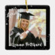 Criar um ornamento comemorativo de férias de manutenção comemorativo, personalizado com duas fotos do formando (uma na frente e outra no verso), seu nome e ano de aula com o FORMANDO de título da tipografia do rolo moderno contra um fundo preto editável com estrelas. Entre em contato com o designer por meio do Zazzle Chat ou makeitaboutyoustore@gmail.com se você quiser que este design seja modificado ou outro produto.