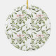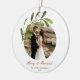 Um belo ornamento da árvore de Natal para comemorar seu primeiro Natal como um casal casado. O design apresentou sua foto favorita em uma abertura em círculo enfeitiçada com um ramo de água de névoa. Personalize o título da fonte do script cursivo vermelho e seus nomes em verde escuro. No verso está um padrão de ramos de degustação de aquarelas.