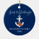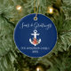 Stylish Calligraphy Script Nautical Seas & Greetings Navy Blue Ornament. Anchor topped with Watercolor Floral including red poinsettias, pine cones and other beautiful winter greenery. Photo Back.