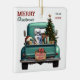Um caminhão de coleta de retro azul lacrimogêneo carregar uma árvore de Natal decorada e pacotes de presentes neste Enfeites de natal de vidro bonito. Olhar para fora do portão é um lindo cão Siberiano Husky. Um cartaz de madeira rústico na pára-choque diz "Feliz Natal". O texto vermelho e verde estilizado no topo à esquerda diz "MERRY CHRISTMAS", com seu nome (ou do seu cachorro) e o ano à direita. Ambos os lados têm a mesma imagem.