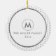 Esse Enfeites de natal cerâmico personalizável apresenta um design floco de neve com brilho prateado na frente com medalhão simples de monograma da família no verso com inicial de monograma da família, nome e data personalizável no verso. Personalize por um presente exclusivo.