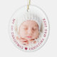 Este elegante ornamento de Natal de novo para novos pais, deste bebê elegante, apresenta uma foto de bebê no centro com tipografia circular vermelha que diz "Meu Natal de 1rua (nome) 20XX" para personalizar. A parte de trás do ornamento tem a palavra "Joy" em um roteiro vermelho moderno, escrito à mão. De nossos corações aos seus Felizes Feriados!