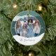 Um Enfeites de natal moderno e aconchegante, ao estilo hygge, com uma foto favorita em um fundo de neve com blocos coloridos, na natureza suave, inspirou cores de férias. Personalize com os seus nomes ou nome de família por baixo e o ano por ambos os lados. Adicione uma segunda foto ao verso.