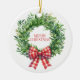 Este ornamento cerâmico de Natal personalizado apresenta uma coroa verde com arco de gingham vermelho. Personalize com sua escolha de texto especial, nome e data na frente e atrás. Perfeito para sacos de presentes e favoritos para festas.
