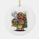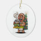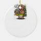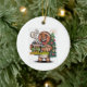 A joyful, cartoon-style Gingerbread Man, depicted with a wide, enthusiastic smile and rosy cheeks. He's wearing a simple white apron and heartily holding up a clear mug filled with dark, steaming coffee, with a prominent plume of steam curling upwards. The text "Spicy and Caffeinated" is creatively integrated onto the coffee mug in a bold, vibrant, multi-colored font, featuring subtle star and flake embellishments. In the background, a minimalist yet festive green Christmas tree is adorned with red and gold baubles, topped with a star, and radiating faint yellow light rays. The overall style is clean, cheerful, and graphically strong, with clear outlines.
