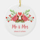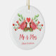 Decorre sua árvore com este design "Sr. e Sra.", com uma bonito aquarela de dois cardeais vermelhos. Os pombinhos são face a face, tocados em verduras sazonais com coração entre eles. Por baixo de "Sr. e Sra." está escrito em divertida tipografia moderna e você pode personalizar com os primeiros nomes dos casais. Na parte de trás há um pequeno coração vermelho coordenador e você pode adicionar o ano de Natal ou outro texto. Perfeito para casais recém-casados.