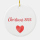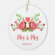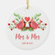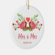 Decorre sua árvore com esta design da "Sra. & Sra.", com uma bonito aquarela de dois cardeais vermelhos. Os pombinhos são face a face, tocados em verduras sazonais com coração entre eles. Por baixo de "Sra. e Sra." está escrito em divertida tipografia moderna e você pode personalizar com os primeiros nomes dos casais. Na parte de trás há um pequeno coração vermelho coordenador e você pode adicionar o ano de Natal ou outro texto. Perfeito para noivas recém-casadas.