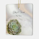 Personalize o elegante Succulento Verde em Ornamento Branco para comemorar e lembrar o dia em que você foi casado. Crie um único favor de uma espécie de partido, salve a data ou guarde o presente para a noiva e o noivo recém-casados. Este ornamento natural clássico e personalizado de casamentos apresenta uma fotografia floral digitalmente pintada de uma planta suculenta verde com um véu branco e fundo branco de cebola.