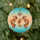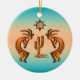 Personalize este Enfeites de natal "Um dos tipos" do sudoeste de Kokopelli! Ele apresenta dois Kokopelli sudoeste em cobre e preto tocando flauta e dançando em volta de um cacto sob o sol em um... Turquoise e um fundo solar laranja! Design De Arte Original Pelo Artista Kerry Miller.