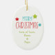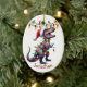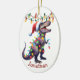Na frente deste adorável ornamento cerâmico de manutenção para uma criança está um dinossauro T-Rex vestindo um chapéu de Papai Noel vermelho e branco. Ele está olhando para uma corda de luzes coloridas acima, enquanto embrulhado na corda de luz que ele já rasgou. O nome do seu filho está no fundo. O verso do ornamento tem uma mensagem de Feliz Natal e sua assinatura. Perfeito para qualquer criança que ama dinossauros.