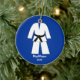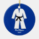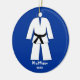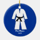 Um Enfeites de natal de artes marciais personalizado. Um uniforme de cinta preta sobre fundo azul. Perfeito para Taekwondo, Karate, Judo e muito mais. Excelente para crianças ou adultos. Personalize facilmente!