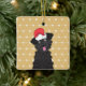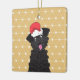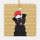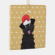 Bonita, cabeleira encaracolada, preta, poodle teacup com chapéu vermelho de Papai Noel em cima da cabeça na frente. Olhos adoráveis e língua rosa para fora. Fundo de ouro e diamante geométrico branco e fundo de padrão de pontos em ambos os lados. Nome personalizável e datas no verso. Ilustração gráfica de cão por: Lori@SaltTownStudio