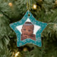 A frente deste ornamento festivo em forma de estrela tem sua fotografia enquadrada em um bonito padrão verde-lacrimogêneo e estrelas cintilantes prateadas. O outro lado do ornamento mantém seu texto personalizado em um talo correspondente em uma estrela branca que está junto com o mesmo padrão de estrelas bonito. É fácil substituir a foto da amostra pela sua; use personalizar para mover sua foto para a melhor posição para a forma de estrela. *Observe que a imagem está impressa e não contém brilho real.*