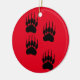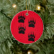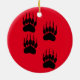 Impressões bonitas de pata de ursos no estilo de desenho animado. ornamentos cerâmicos personalizados com fundo vermelho. Ideia de decoração de Natal.