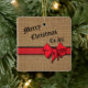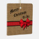 Padrão Faux Burlap, terminado com um arco vintage, sentado sobre uma fita vermelha de xadrez. O roteiro de Natal expressa Feliz Natal para todos. Deixe como está ou mude o texto para personalizar com o seu sentimento da estação. No verso, você pode personalizar com o nome e a data da sua família.