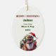 Há uma imagem de um dinossauro Tiranossauro Rex engraçado em cada lado do Enfeites de natal das crianças personalizadas. Na frente, o dinossauro vestido como Papai Noel ruge "RAWR!" diante de presentes brilhantemente envoltos. No verso, uma imagem menor está abaixo do seu texto personalizado. Excelente para um menino ou menina que ama dinossauros.