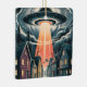 This dramatic illustration depicts a UFO hovering above a quiet suburban street at dusk, casting a vivid orange-yellow beam over houses and a lone figure observing the spectacle. Rich, moody colors of deep blues, purples, and grays contrast with the glowing beam, creating a retro-inspired, surreal atmosphere. Bold outlines and stylized details make this artwork perfect for fans of sci-fi, mysterious phenomena, and cinematic night scenes.