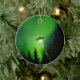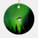 UFO que paira sobre árvores spruce na noite com aurora boreal verde no fundo.