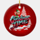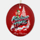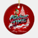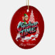 Um elfo animado de desenho animado com roupas verdes e orelhas pontiagudas ondas de uma paisagem nevada. As palavras "Horário de Natal" são escritas em letras grandes, coloridas, em estilo de grafite, com um esquema de cor rosa e azul. O fundo é vermelho vivo, sugerindo uma atmosfera festiva de férias. Os flocos de neve caem suavemente, adicionando ao toque de inverno.