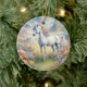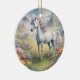 Um ornamento cerâmico mostrando uma imagem sonhosa de um unicórnio branco com um mané arco-íris em um campo de flores. Ao fundo estão montanhas majestosas. O presente perfeito para dar àqueles que amam unicórnios mágicos e místicos. Contém conteúdo generativo.