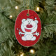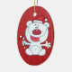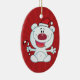 O urso polar do White Christmas bonito que veste um chapéu vermelho do papai noel e um sorriso grande está mantendo um bastão de doces listrado vermelho e branco contra um fundo vermelho do starburst.